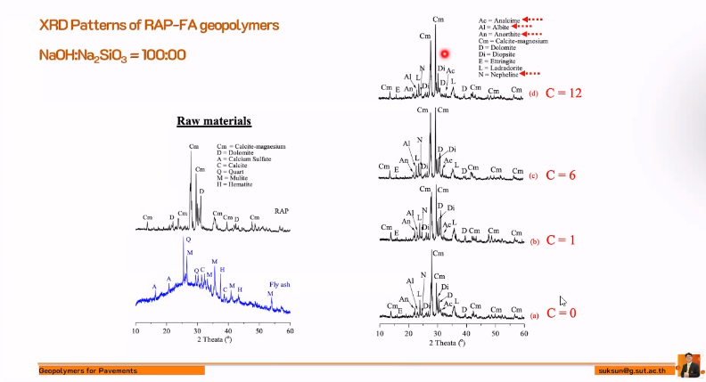 在讲座中,Suksun Horpibulsuk首先分析了利用再生沥青路面和粉煤灰(RAP-FA)以混合物和地聚合物两种形式作为道路建设的环保材料的可行性,并介绍了湿干条件下地聚物路面沥青材料的强度特性、矿物和微观结构性能、重金属固化效果。Suksun Horpibulsuk着重强调了地聚物胶凝活性的碱激发原理,被激发后的地聚合物提高了RAP材料的强度和耐久性,同时,低聚物的固化效果减少了重金属的流失,其成果也证实了RAP-FA混合料作为可持续路面材料的可行性。